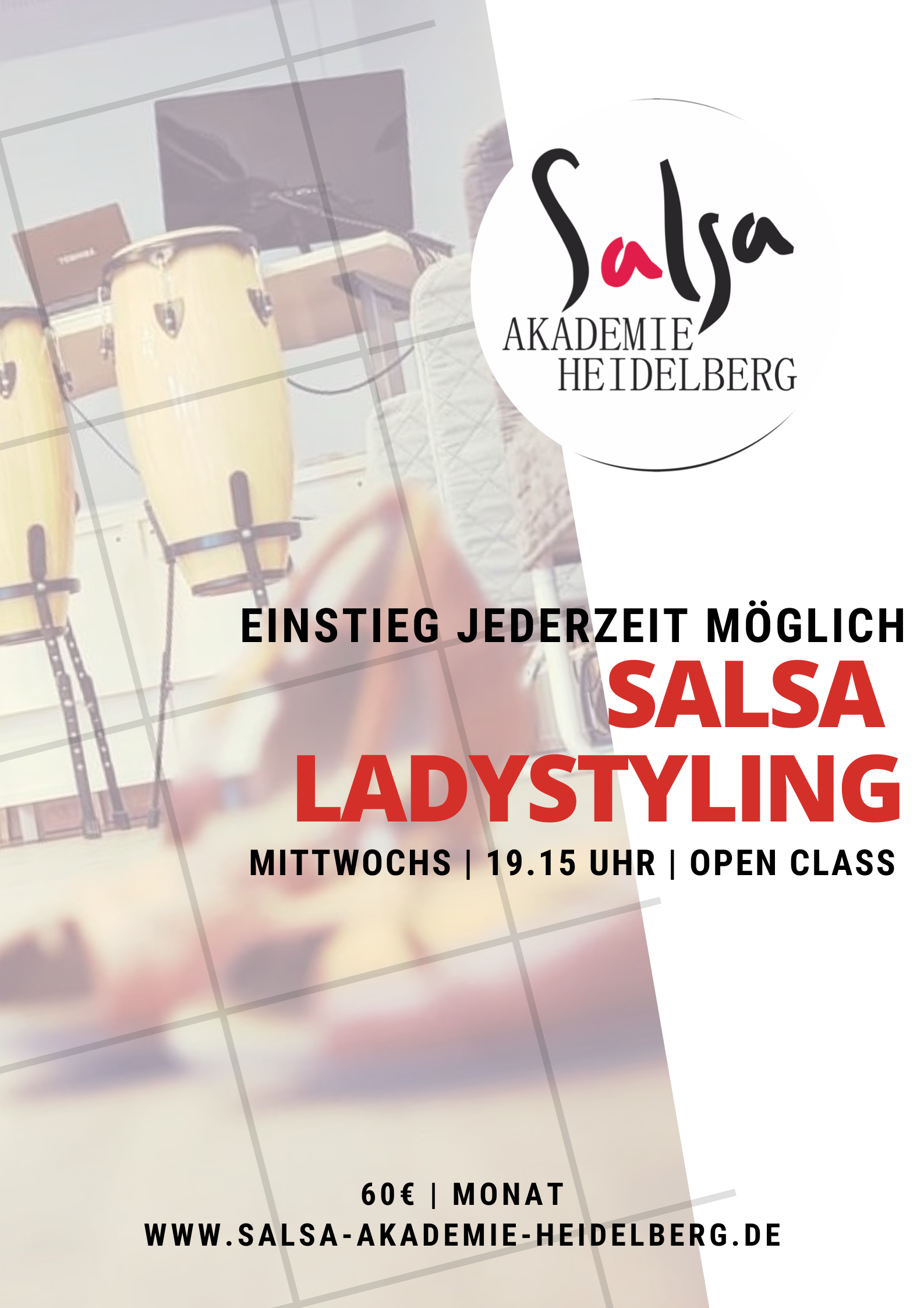Salsa On1 Ladystyling Beginner | Basics mit CAROLIN Kosten regulär 60€ p.P. | Schüler & Studenten 45€ | 4 Wochen | á 60 Minuten | Mittwochs 18.00-19.00 Uhr Für den Studentenrabatt bitten wir um Vorlage eines Nachweises. Teilnahmegebühr: EUR 60.00 |