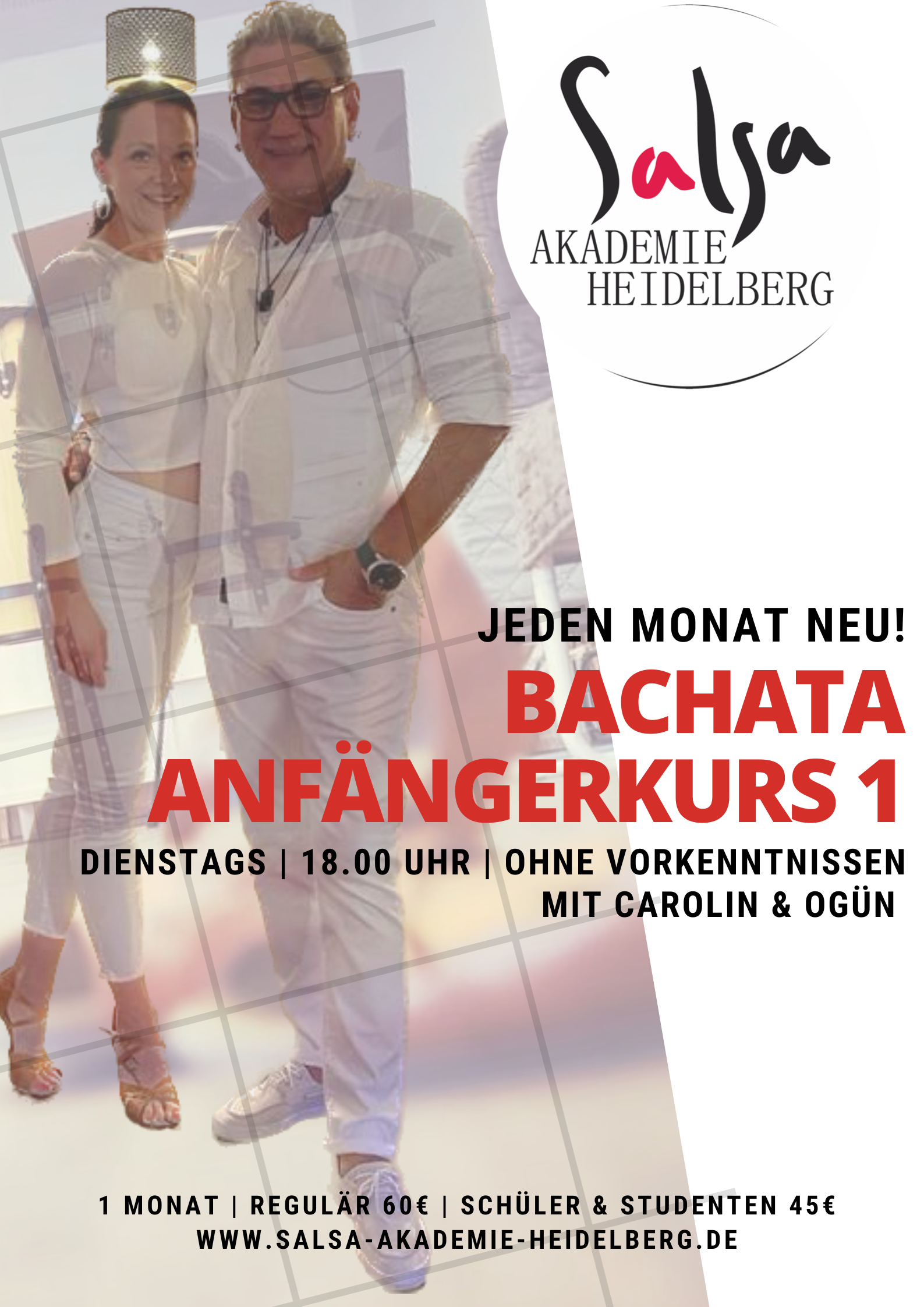 4 Wochen Bachata Anfängerworkshop 1 (ohne Vorkenntnisse) mit OGÜN & CAROLIN Kosten 60€ p.P. | 4 Wochen Intensivworkshop | á 60 Minuten | Dienstags 18.00 - 19.00 Uhr Für den Studentenrabatt bitten wir um Vorlage eines Nachweises Teilnahmegebühr: EUR 60.00 |