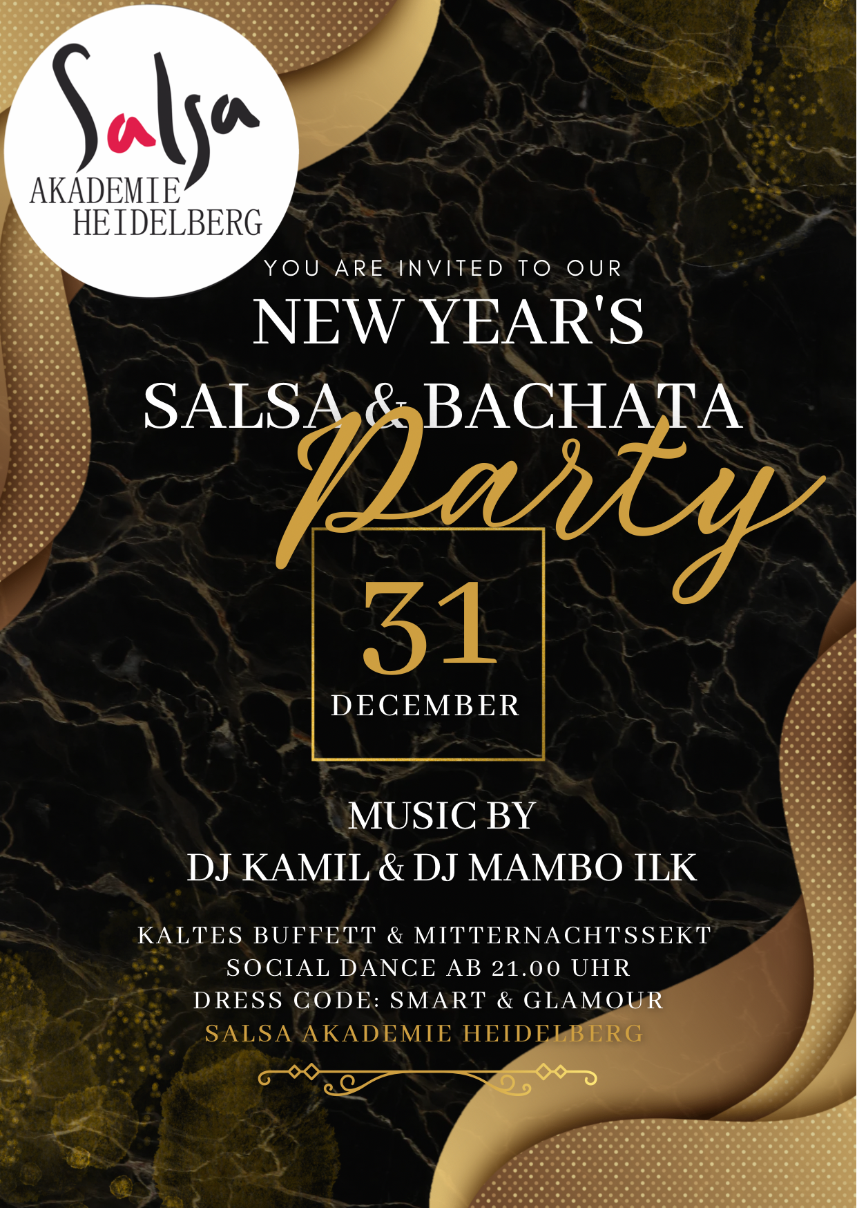SILVESTER Salsa & Bachata Deluxe Party SILVESTER in der Salsa Akademie Heidelberg | 31 Dezember | 21 Uhr | DJ Saber Teilnahmegebühr: EUR 25.00 |