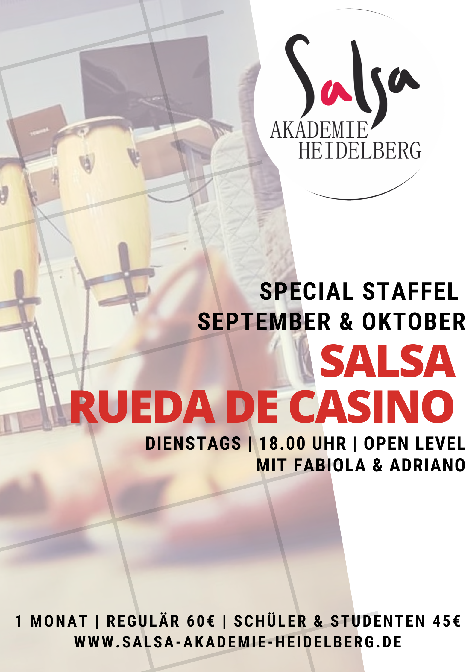 Special Staffel: SALSA RUEDE DE CASINO mit ADRIANO & FABIOLA Kosten 60€ p.P. | 4 Wochen | á 60 Minuten | Dienstags 18.00 - 19.00 Uhr | Nur im September & Oktober 25 Dieser Kurs ist ein fortlaufender Kurs, ein Einstieg ist jederzeit möglich! Teilnahmegebühr: EUR 60.00 |