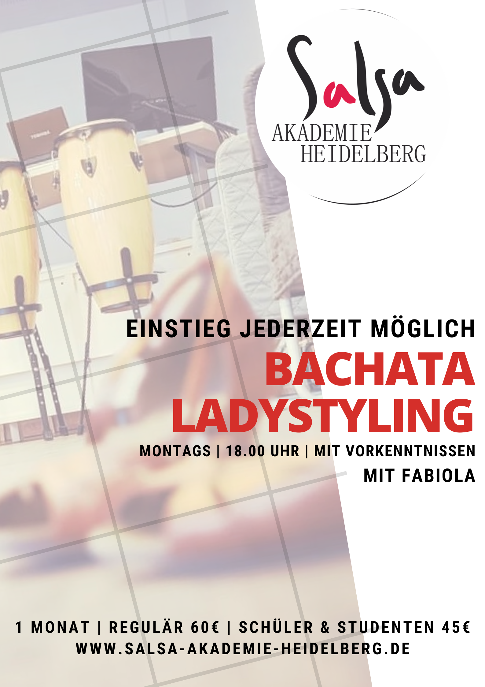 Bachata Ladystyling mit FABIOLA Kosten 60€ p.P. | 4 Wochen | á 60 Minuten | Montags 18.00 - 19.00 Uhr Dieser Kurs ist ein fortlaufender Kurs, ein Einstieg ist jederzeit möglich! Teilnahmegebühr: EUR 60.00 |