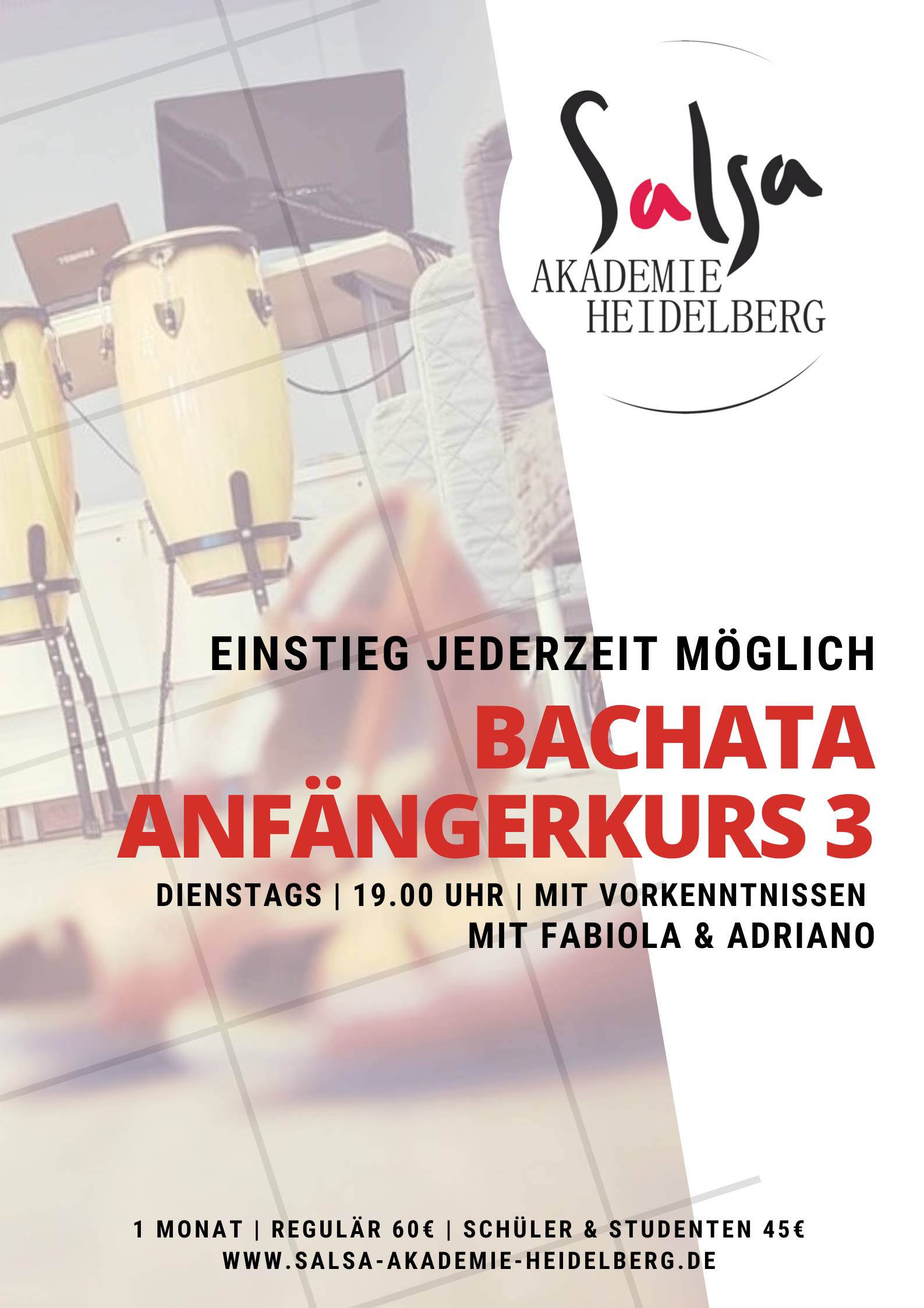 Bachata Anfängerkurs 3 (mit Vorkenntnissen) mit ADRIANO & FABIOLA Kosten 60€ p.P. | 4 Wochen | á 60 Minuten | Dienstags 19.00 - 20.00 Uhr Dieser Kurs ist ein fortlaufender Kurs, ein Einstieg ist jederzeit möglich! Für den Studentenrabatt bitten wir um Vorlage eines Nachweises Teilnahmegebühr: EUR 60.00 |