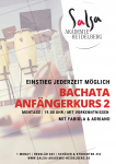 Bachata Anfängerkurs 2 (mit Vorkenntnissen) mit ADRIANO & FABIOLA Kosten 60€ p.P. | 4 Wochen | á 60 Minuten | Montags 19.00 - 20.00 Uhr Dieser Kurs ist ein fortlaufender Kurs, ein Einstieg ist jederzeit möglich! Für den Studentenrabatt bitten wir um Vorlage eines Nachweises Teilnahmegebühr: EUR 60.00 |